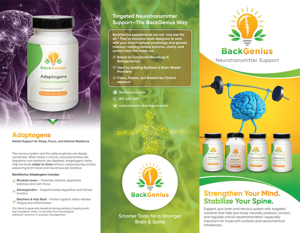 Designed for use in functional neurology and integrative spine care clinics, the BackGenius Neurotransmitter Support Trifold Brochure helps patients understand how brain chemistry impacts scoliosis, stress, focus, and nervous system regulation.